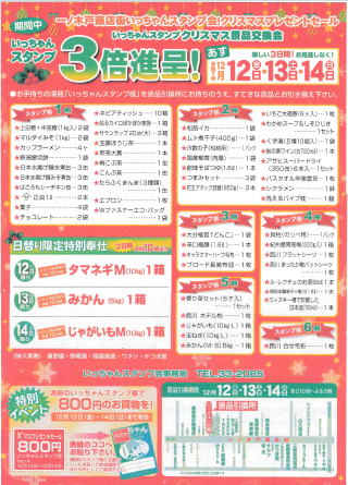 2025-12-12 一ノ木戸商店街年末恒例のいっちゃんスタンプ『クリスマス景品交換会』が始まった。期間は、12月12日(金)から14日(日)までの3日間、午前10時から午後5時まで。一ノ木戸商店街スタンプ会が、1年間の商店街利用のお客さんに、感謝のを込めて開催する。この3日間は、スタンプ3倍セールも実施している。満冊になったスタンプ帳で、いろいろな景品と交換することができるお楽しみの3日間だ。ぜひ、大勢の皆さんから訪問していただきたいものだ。