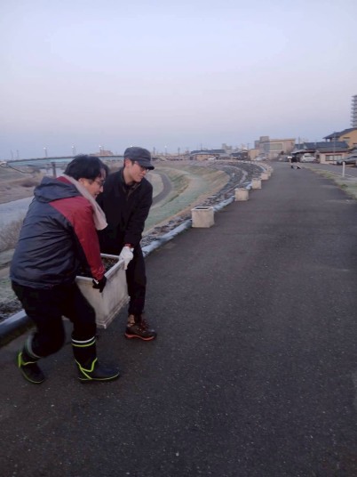 午後4時30分から、プランター設置作業を実施した。3年計画の1年目として、五十嵐川右岸昭栄大橋と一 新橋の間の下流部にい18個のプランターを配置した。植栽は下記の花