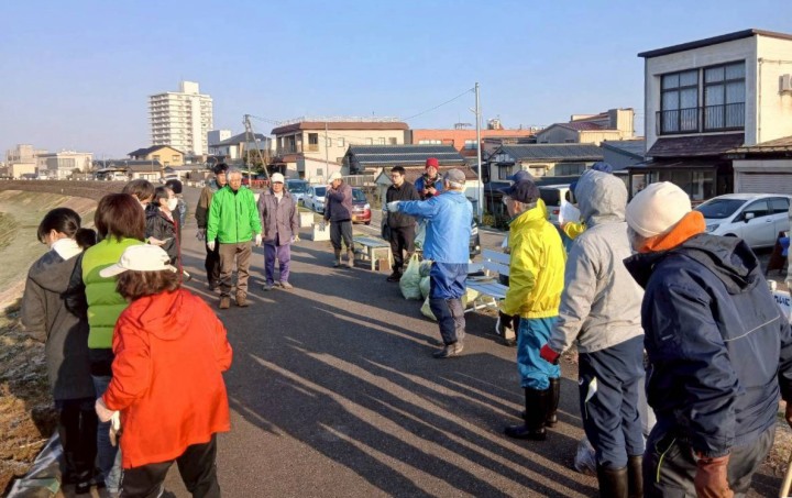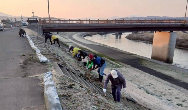 「五十嵐川を愛する会」が主催した五十嵐川堤防の草刈りに参加した 。